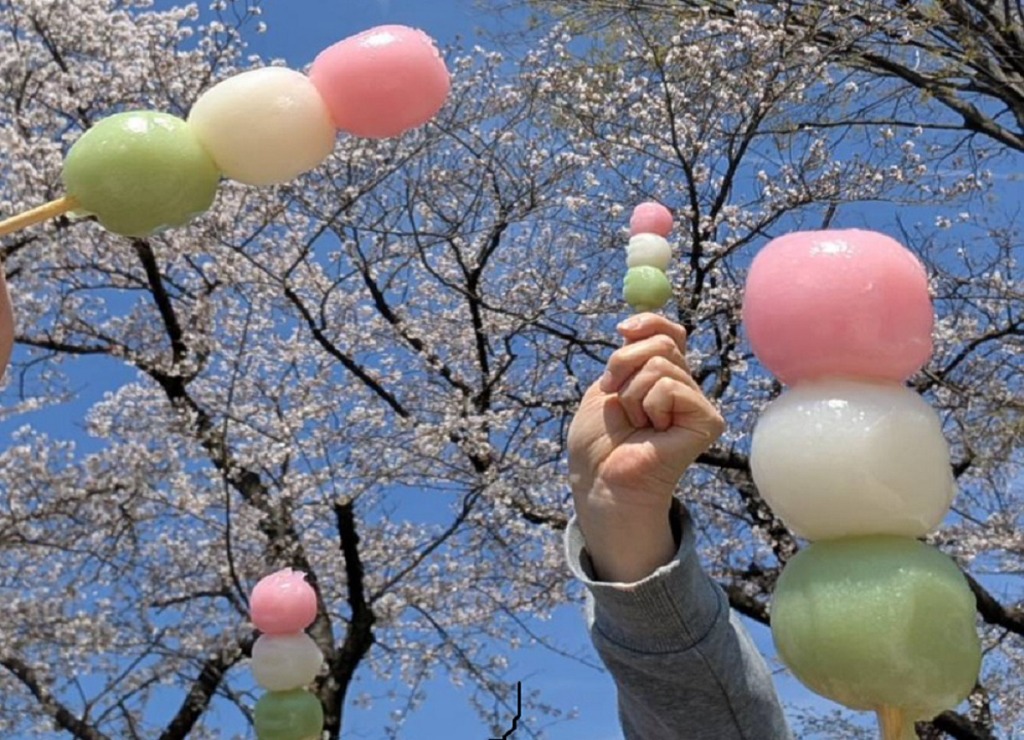 満開の桜の下、青空を見上げながらお花見団子を掲げてパシャリ。